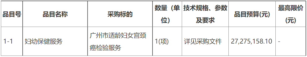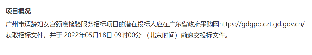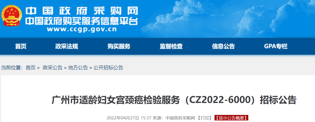 4月27日,中国政府采购网发布《广州市适龄妇女宫颈癌检验服务(CZ2022-6000)招标公告》。