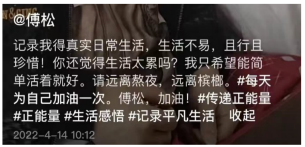 2022年4月他在个人抖音账号分享:我只希望能简单活着就好。请远离熬夜,远离槟榔。