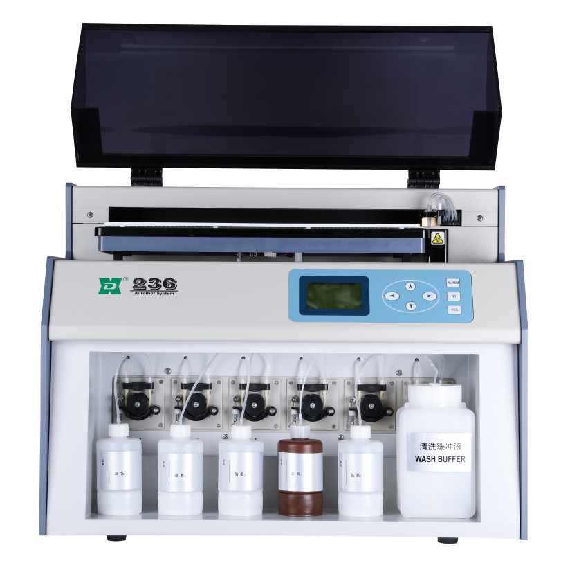 自动蛋白印迹仪是一台智能化自动操作蛋白(免疫)印迹(Western blot)试剂盒的仪器,按照实验要求,并添加检测标本,用已设定的操作程序由机器来自动配液,吸液,孵育,冲洗,加底物液等全过程,同时,吸液量、分液量、时间、孵育平台摆动速度等都可以按实际需要来设定或编辑。