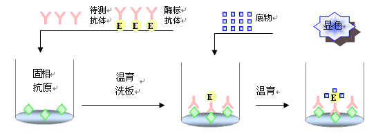 方法:用已知抗体包被,加入待测血清,再加酶标抗体,加底物显色。