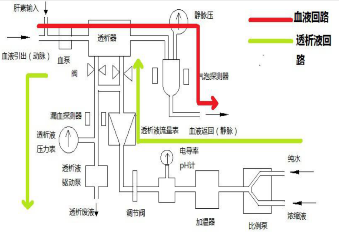 血液和透析液在透析器(人工肾)内借半透膜接触和浓度梯度进行物质交换,使血液中的代谢废物和过多的电解质向透析液移动,透析液中的钙离子、碱基等向血液中移动。从而清除患者血液中的代谢废物和毒物;调整水和电解质平衡:调整酸碱平衡。具有人体肾脏的部分功能(但不能替代肾脏的内分泌和新陈代谢功能)。