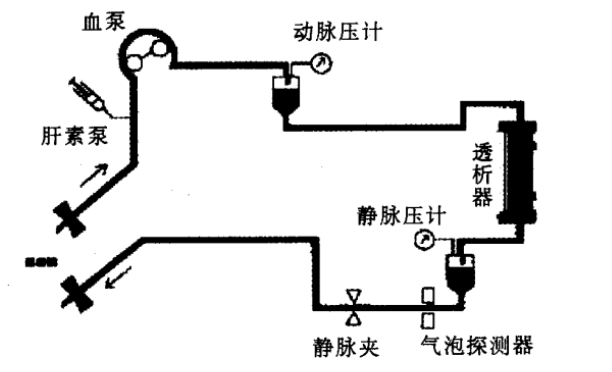 血路部分包括:血泵、肝素泵 气泡探测器、动静脉压力监测、静脉夹等。如图所示。
