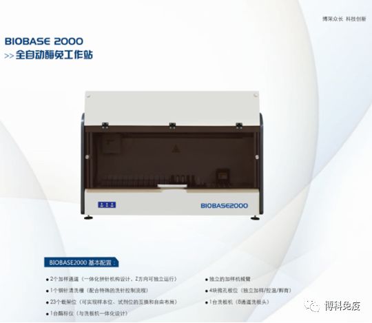 BIOBASE2000是一款性能优异并且经济适用的全自动酶免工作站,其基本配置为2个加样通道,4个微孔板位,1台洗板机(含4个洗板液通道)、1台酶标仪,还有包括样本载架在内的5种共23个载架位。典型处理能力为,一次运行可以处理90余样本的4项检测,或者40余样本的8项检测(例如术前病毒8项)。