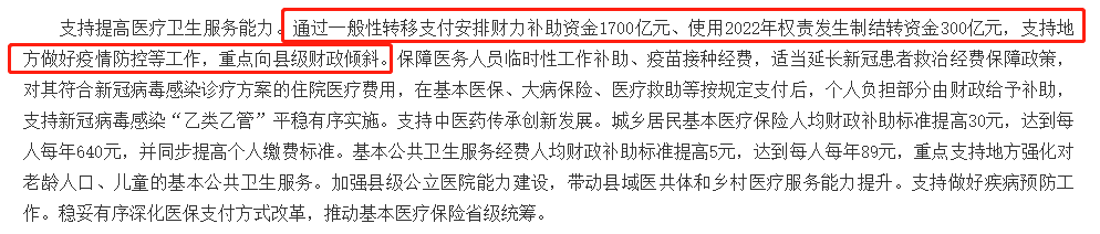 根据《预算报告》显示,2023年,在医疗卫生服务方面,中央财政计划通过一般性转移支付安排财力补助资金1700亿元、使用2022年权责发生制结转资金300亿元,支持地方做好疫情防控,重点向县级财政倾斜。