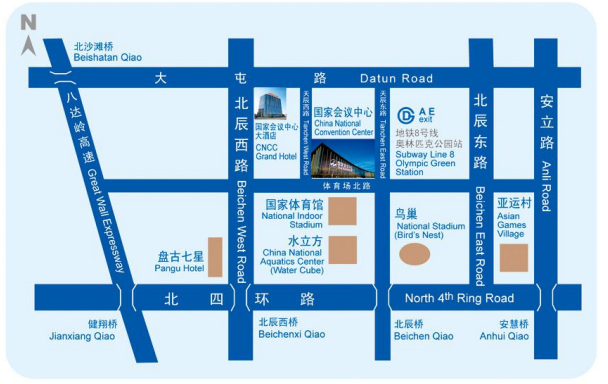 沿北辰西路北行,水立方和国家体育馆北面的建筑即到国家会议中心。