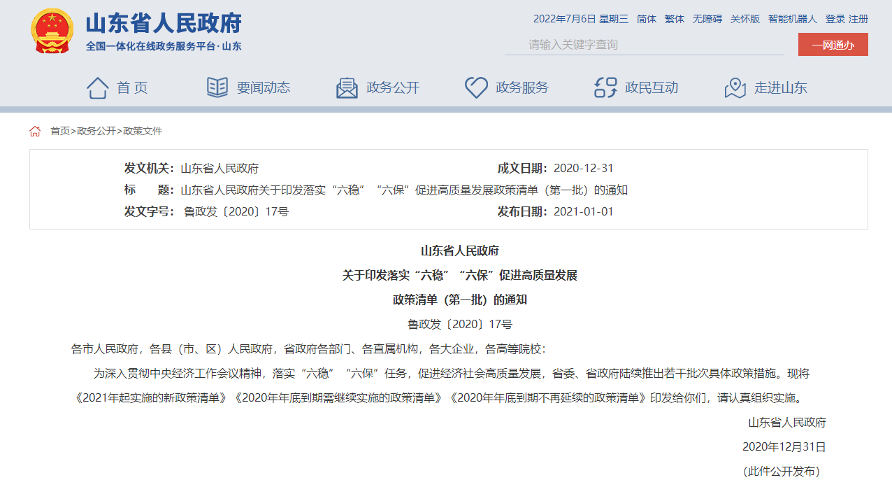 2021年初,山东省政府发布《关于印发落实“六稳”“六保”促进高质量发展政策清单(第一批)的通知》