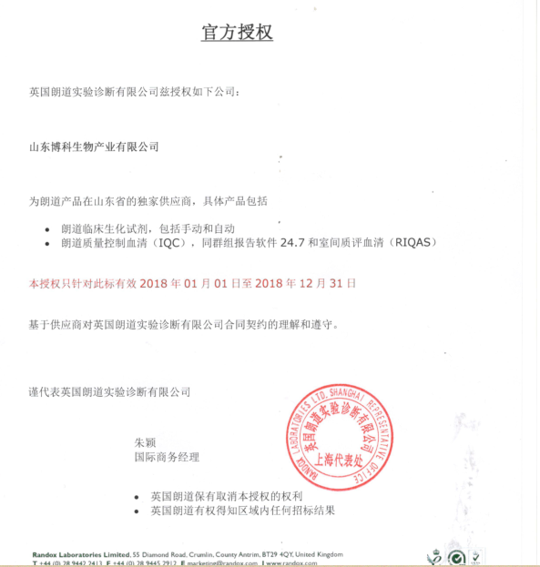 热烈祝贺博科生物续签英国朗道山东独家代理热烈祝贺博科生物续签英国朗道山东独家代理2017年度,博科生物与RANDOX 朗道的合作,取得了非常好的成绩。2017年是朗道在中国区改革的第一年,在此过程中凭借朗道优质的产品质量和博科生物优秀的业务及售后团队,博科生物紧跟国内形势…