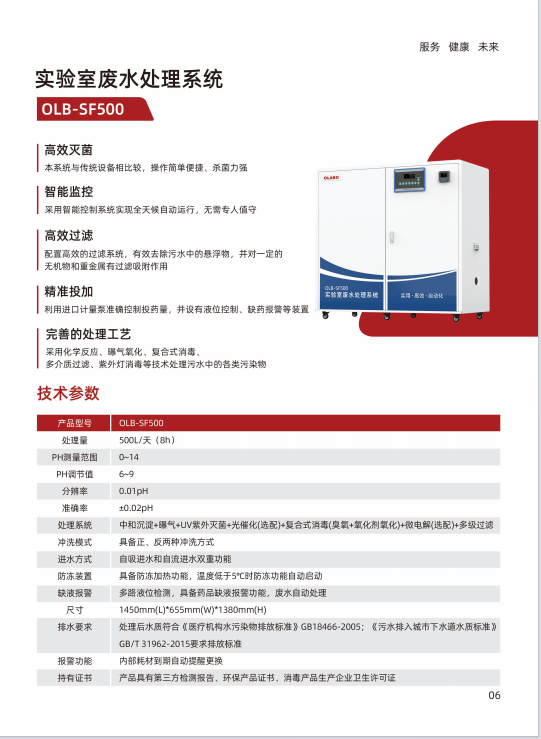 高效灭菌?本系统与传统设备相比较,操作简单便捷、杀菌力强智能监控?采用智能控制系统实现全天候自动运行,无需专人值守?高效过滤?配置高效的过滤系统,有效去除污水中的悬浮物,并对一定的无机物和重金属有过滤吸附作用?精准投加?利用进口计量泵准确控制投药量,并设有液位控制、缺药报警等装置?完善的处理工艺?采用化学反应、曝气氧化、复合式消毒、?多介质过滤、紫外灯消毒等技术处理污水中的各类污染物