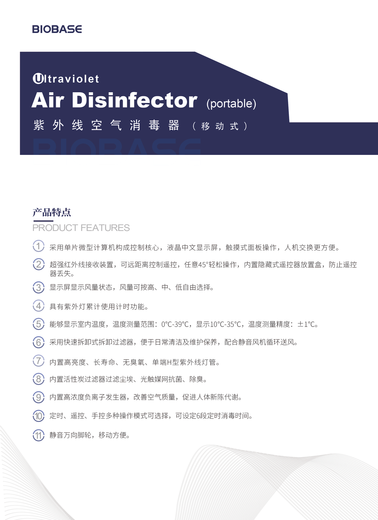采用长寿命、C 波段(波长 253.7nm)无臭氧紫外线循环风抗菌杀毒; |