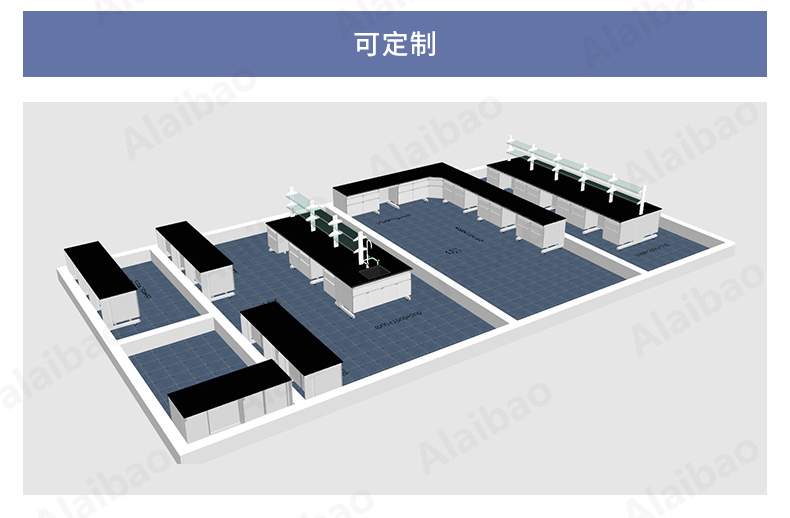 柜体颜色整体为瓷白色,拉手及合页为蓝色,实验台为单个单元柜体组合而成,并配有双柜,单柜,水柜,主机柜,空位,键盘位,单抽位等,尺寸均可定制。