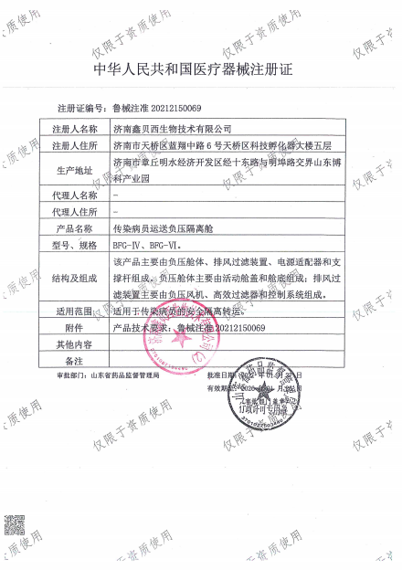 1、用于SARS等烈性呼吸道传染病员的隔离运送,防止病原体扩散,降低医护人员感染率。