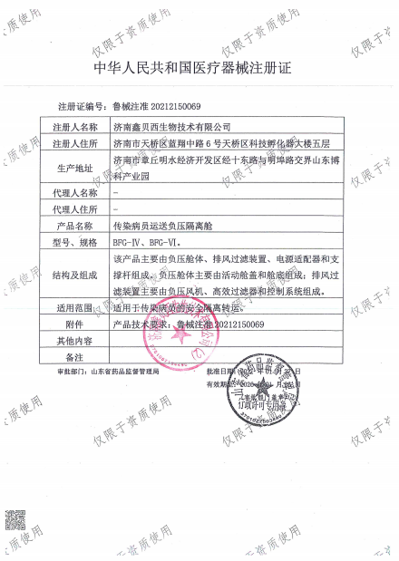 1、用于SARS等烈性呼吸道传染病员的隔离运送,防止病原体扩散,降低医护人员感染率。